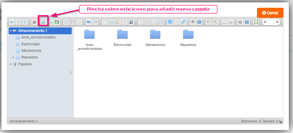 - Se abrirá una ventana emergente donde gestionar las carpetas, tienes que seleccionar la carpeta «Almacén» y dentro de ella crear una carpeta por Familia del Almacén y así será más fácil acceder a ellas de una manera más rápida.