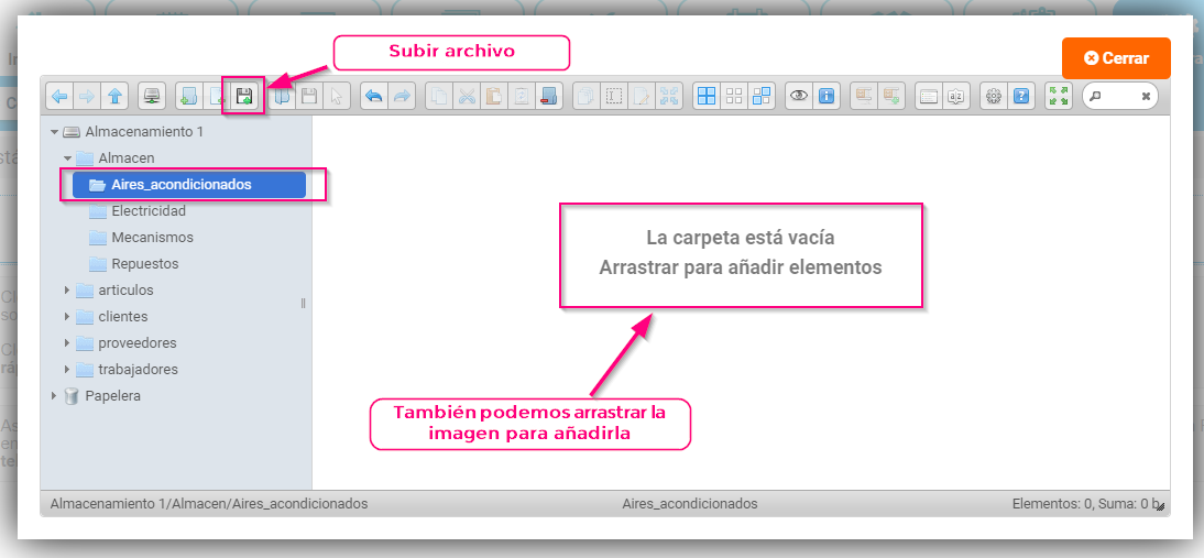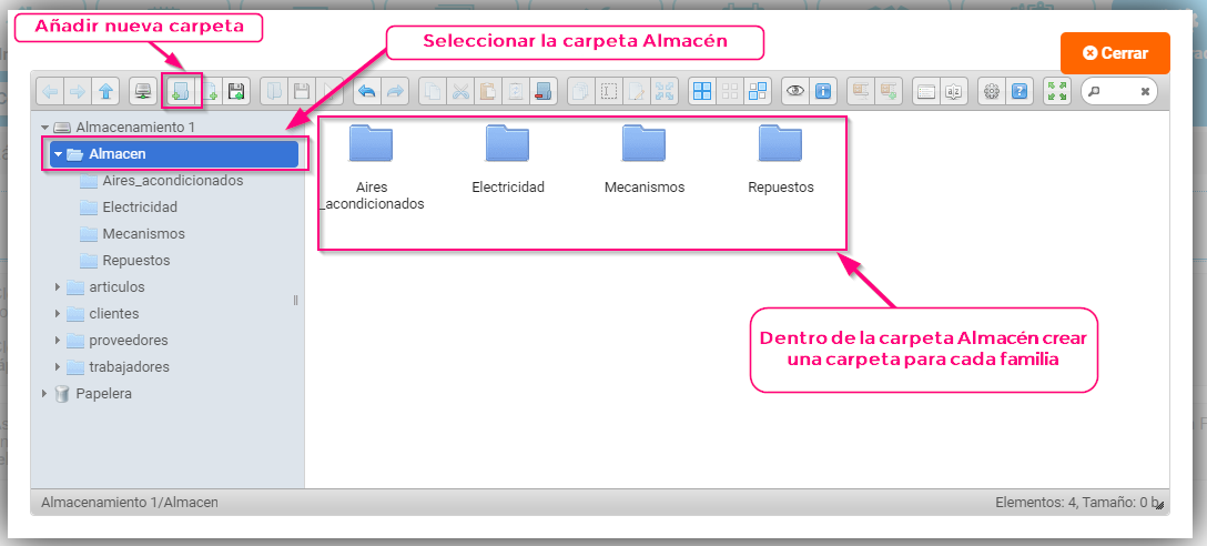 - Se abrirá una ventana emergente donde gestionar las carpetas, tienes que seleccionar la carpeta «Almacén» y dentro de ella crear una carpeta por Familia del Almacén y así será más fácil acceder a ellas de una manera más rápida.