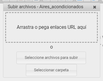 - Si seleccionamos el icono de «Subir Archivo» se nos abrirá otra ventana emergente donde tendremos varias opciones para subir como arrastrar la imagen para añadirla, seleccionar el archivo o la carpeta.
