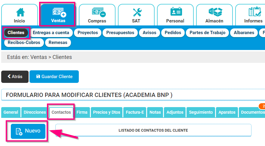 - Para crear un contacto a un cliente debemos de ir a «Editar Cliente» (ya que la aplicación no nos permite añadir contacto cuando creamos uno nuevo) y en formulario de cliente vamos a la pestaña de «Contactos>Nuevo»