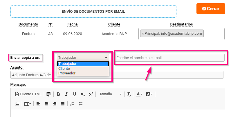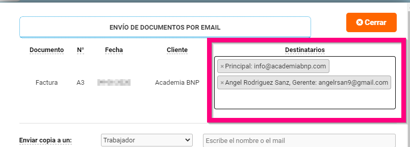- Seleccionando un Trabajador, Cliente o Proveedor, (al tenerlo añadido en la aplicación si escribimos el nombre en el recuadro de la derecha nos aparecerá la persona a la que queremos enviar una copia.