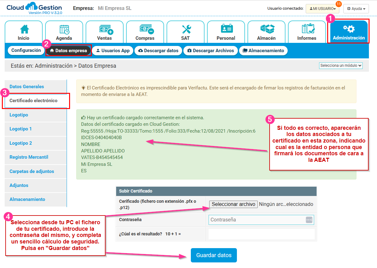 - Ve a la sección: Administración > Datos empresa > Certificado electrónico.