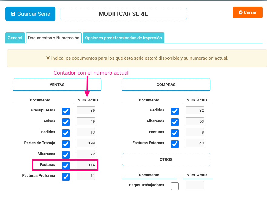 El sistema que numera automáticamente los documentos (Facturas, Presupuestos, etc) funciona mediante un contador que va asociado a la serie. Esto quiere decir que cada serie y cada documento (Factura, Presupuestos, etc) tiene su propio contador y numeración.