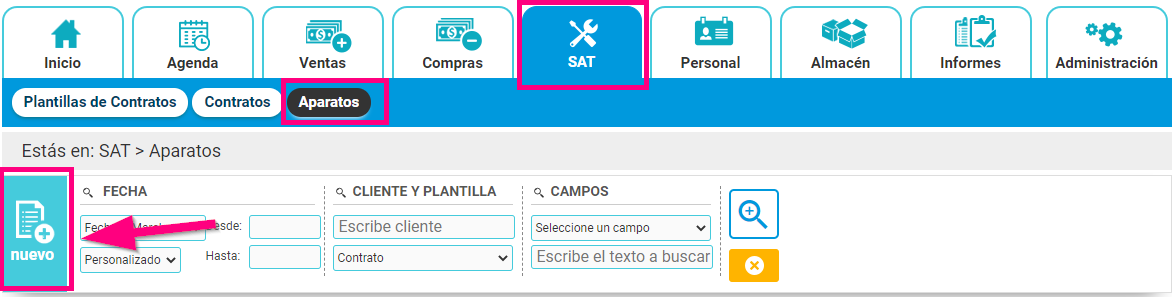 Ve a «SAT > Aparatos» y pulsa en el botón «Nuevo».