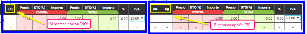 - ¿Sus productos utilizan peso (kg) para calcular el importe? Si activas esta opción, en las líneas de los documentos (Presupuestos, Albaranes, Facturas,…) aparecerá una casilla para poner el peso junto a la cantidad. El importe se calculará en función del peso.