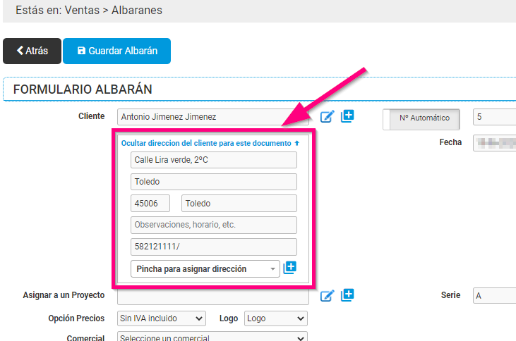 ¡Importante! si modificas los datos de la dirección desde este apartado solo se modificará en el documento, cuando generes otro documento al añadir ese cliente seguirá apareciendo los datos anteriores, si quieres que esto se modifique en todos los documentos que generes tendrás que realizar las modificaciones desde la ficha del cliente.