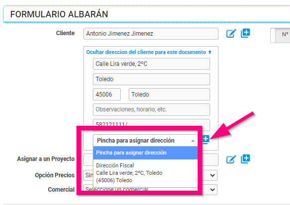 En la parte inferior del formulario podemos ver en negrita «Pincha para asignar dirección», si seleccionamos se nos abrirá las diferentes direcciones que tiene ese cliente asignadas (la dirección fiscal siempre aparecerá en caso de tener añadida una dirección al Cliente).