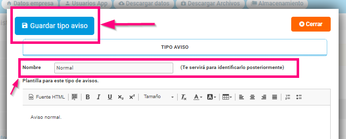 - Cuando creas o editas un Tipo de Aviso tienes dos campos que rellenar: el Nombre y la Descripción.